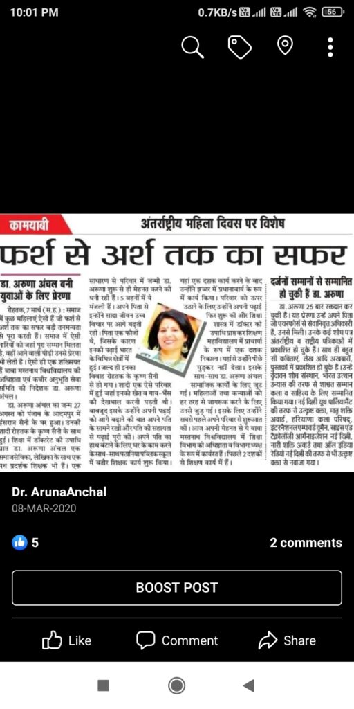 डॉ अरूणा अंचल , बाबा मस्तनाथ विश्वविधयालय , रोहतक, हरियाणा , शिक्षा विभाग , की अधिष्ठाता व विभागाध्यक्ष हैं ।